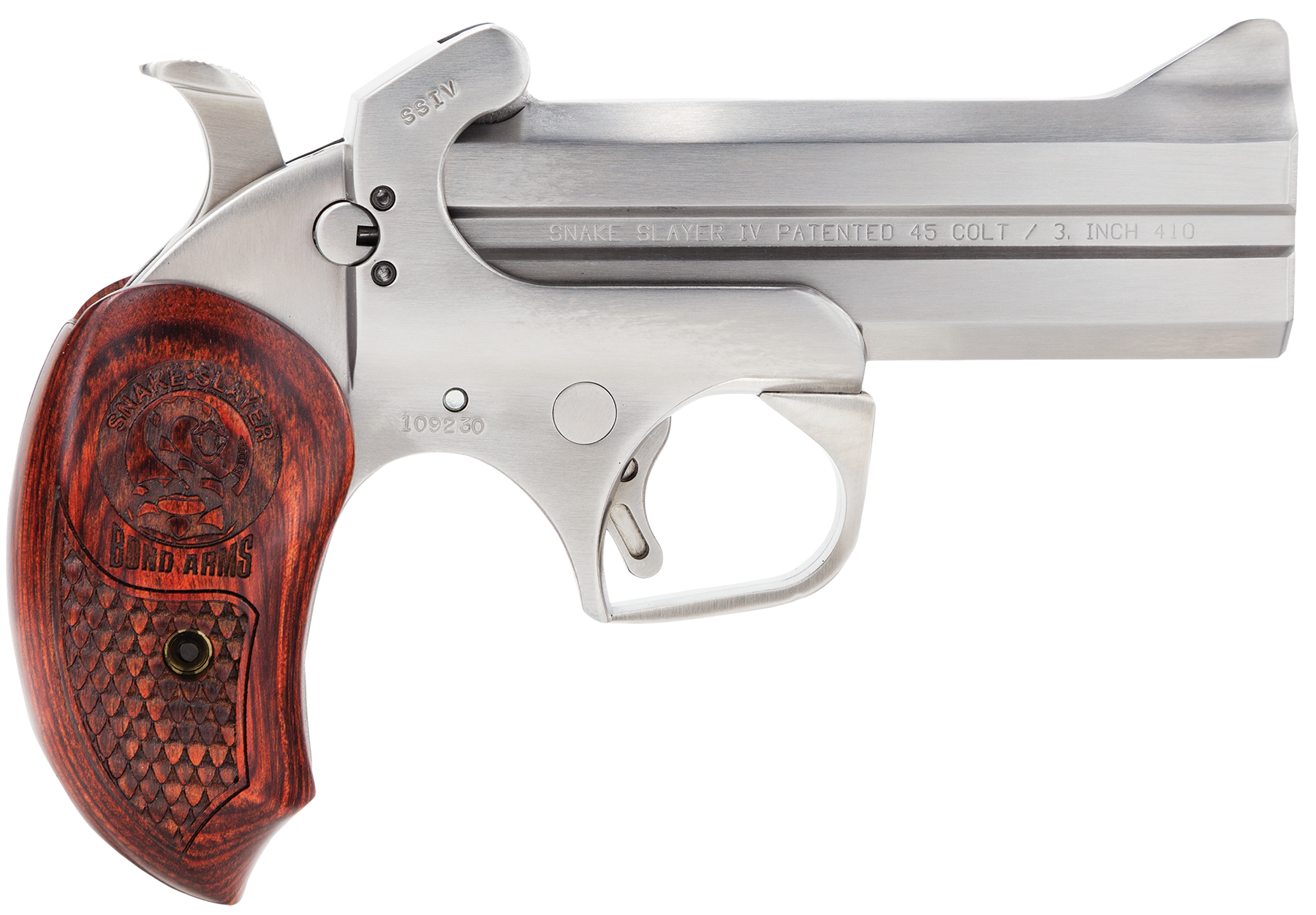 Bond Arms BASS4 Snakeslayer IV 45 Colt (LC) 2rd 4.25″ Barrel, Stainless Metal Finish, Blade Front/Fixed Rear Sights, Automatic Extractors & Rebounding Hammer, Extended Rosewood Grip, Manual Safety