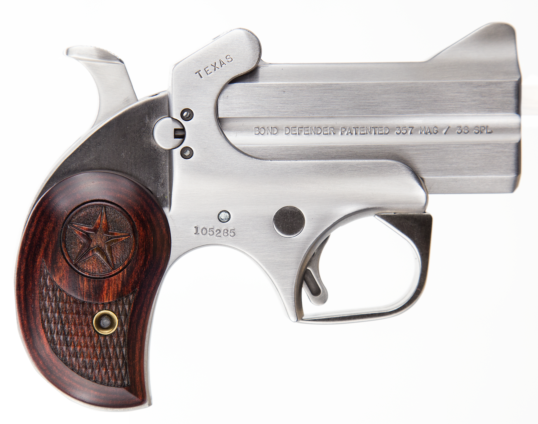Bond Arms BATD Texas Defender 357 Mag/38 Sp 2rd 3″ Barrel, Stainless Metal Finish, Rosewood Grip, Blade Front/Fixed Rear Sights, Manual Safety