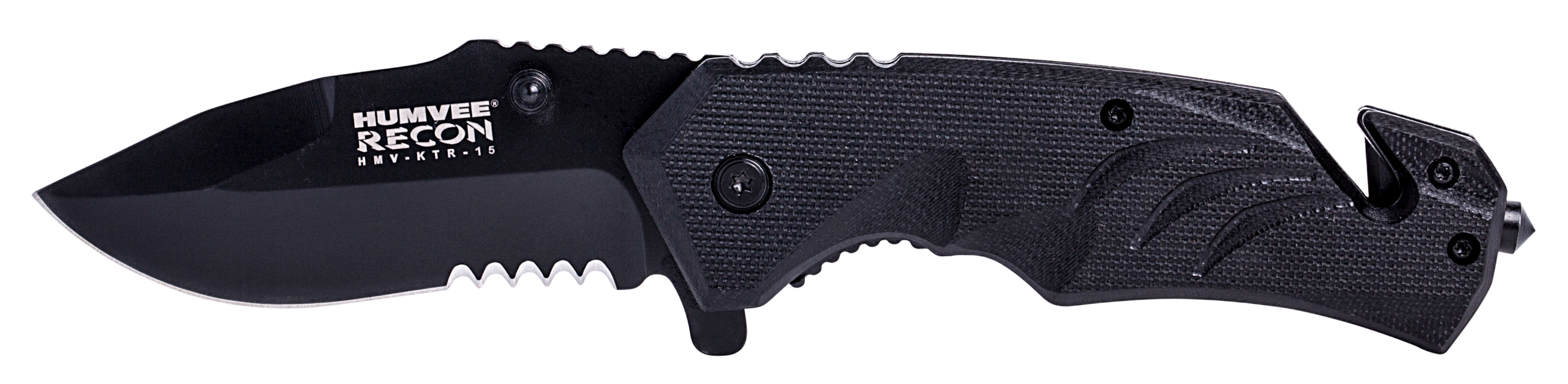 Humvee Adventure Gear HMVKTR15 Tactical Recon 3″ Folding Drop Point Part Serrated Black Stainless Steel Blade/Black Textured Features Glass Breaker/Seat Belt Cutter Includes Pocket Clip
