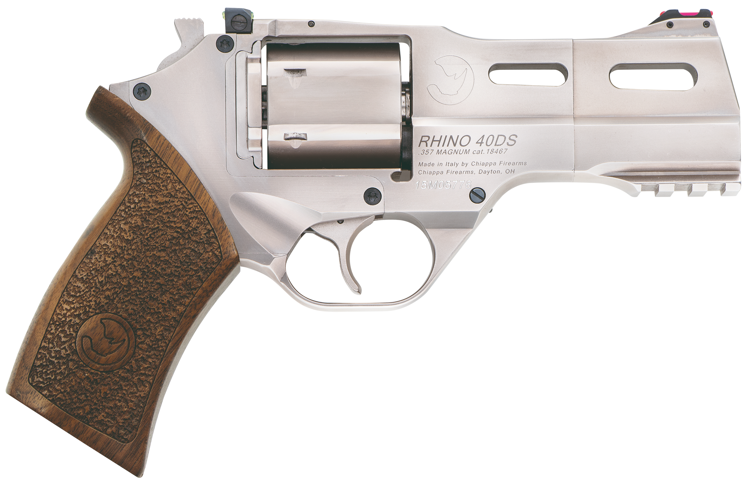 Chiappa Firearms CF340245 Rhino 40SAR *CA Compliant Medium Frame 357 Mag 6 Shot, 4″ Nickel-Plated Steel Barrel & Cylinder, Nickel-Plated Aluminum Frame w/Picatinny Rail, Walnut Grip, Concealed Hammer
