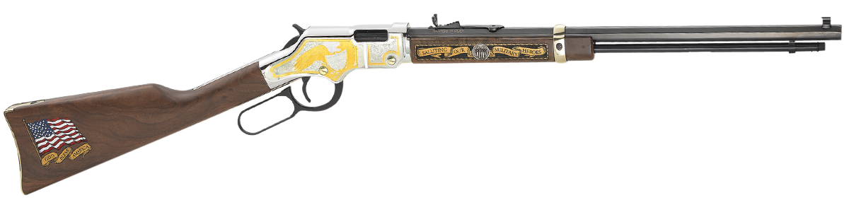 Henry H004MS2 Golden Boy Military Service Tribute 2 Full Size 22 Short, 22 Long, 22 LR, 16 LR/21 Short, 20″ Blued Barrel, Nickel-Plated Metal Finish & American Walnut Stock Right Hand