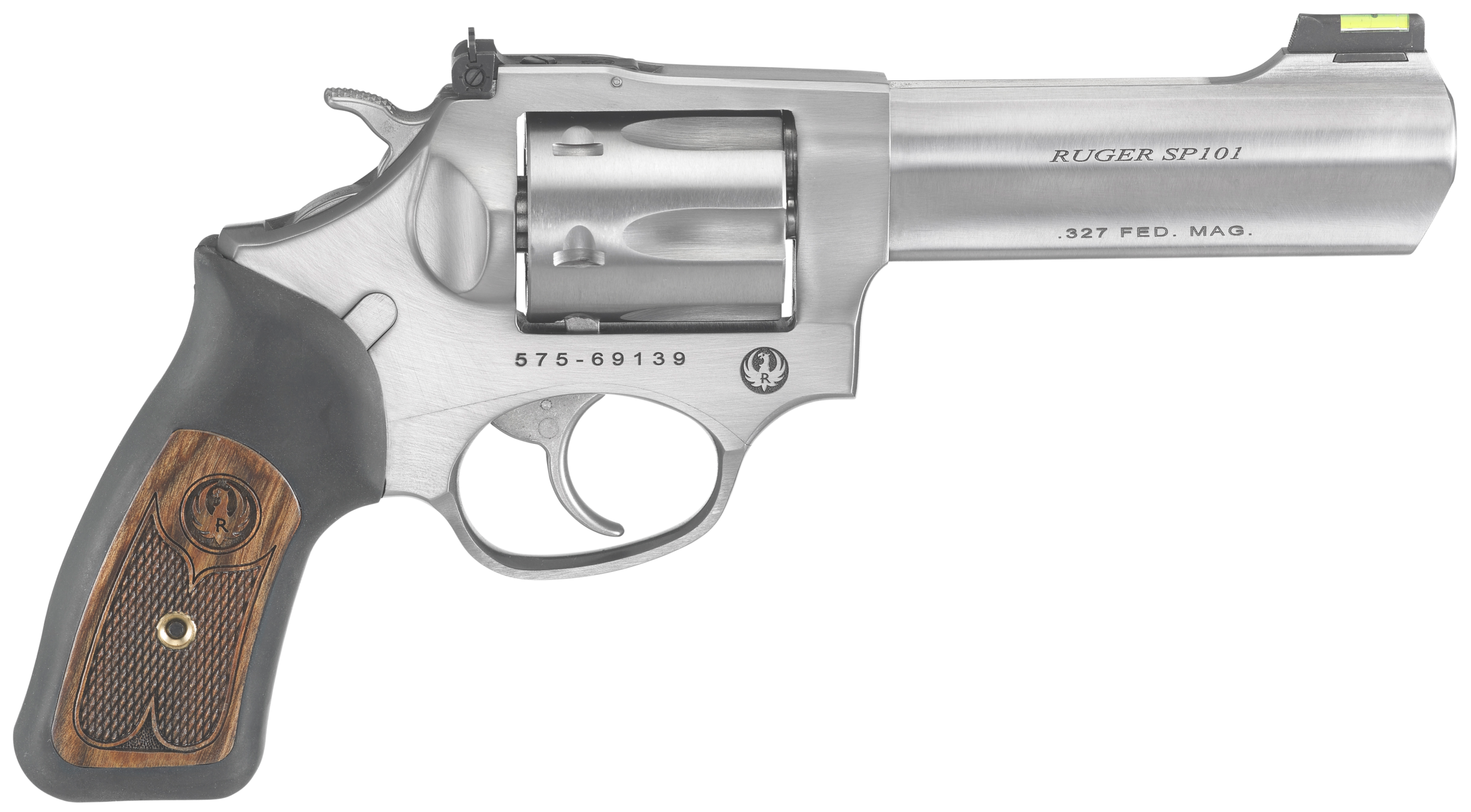 Ruger 5773 SP101 Small Frame 327 Federal Mag 6rd, 4.20″ Satin Stainless Steel Barrel, Cylinder & Frame, Black Rubber w/Wood Insert Grip, Exposed Hammer, Transfer Bar Safety